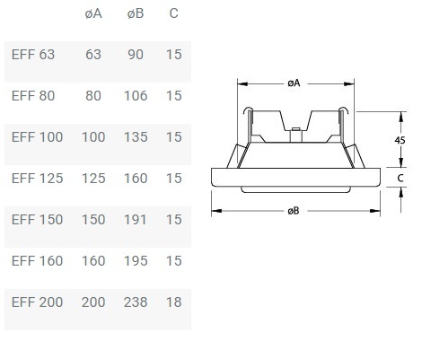 EFF изготавливается из листовой стали и покрашен в белый цвет (RAL 9010-80). Существуют следующие диаметры: ø80, ø100, ø125, ø160 и ø200. Размер ø160 (EFF 160a) подходит как для воздуховодов диаметром 150, так и для воздуховодов диаметром 160.